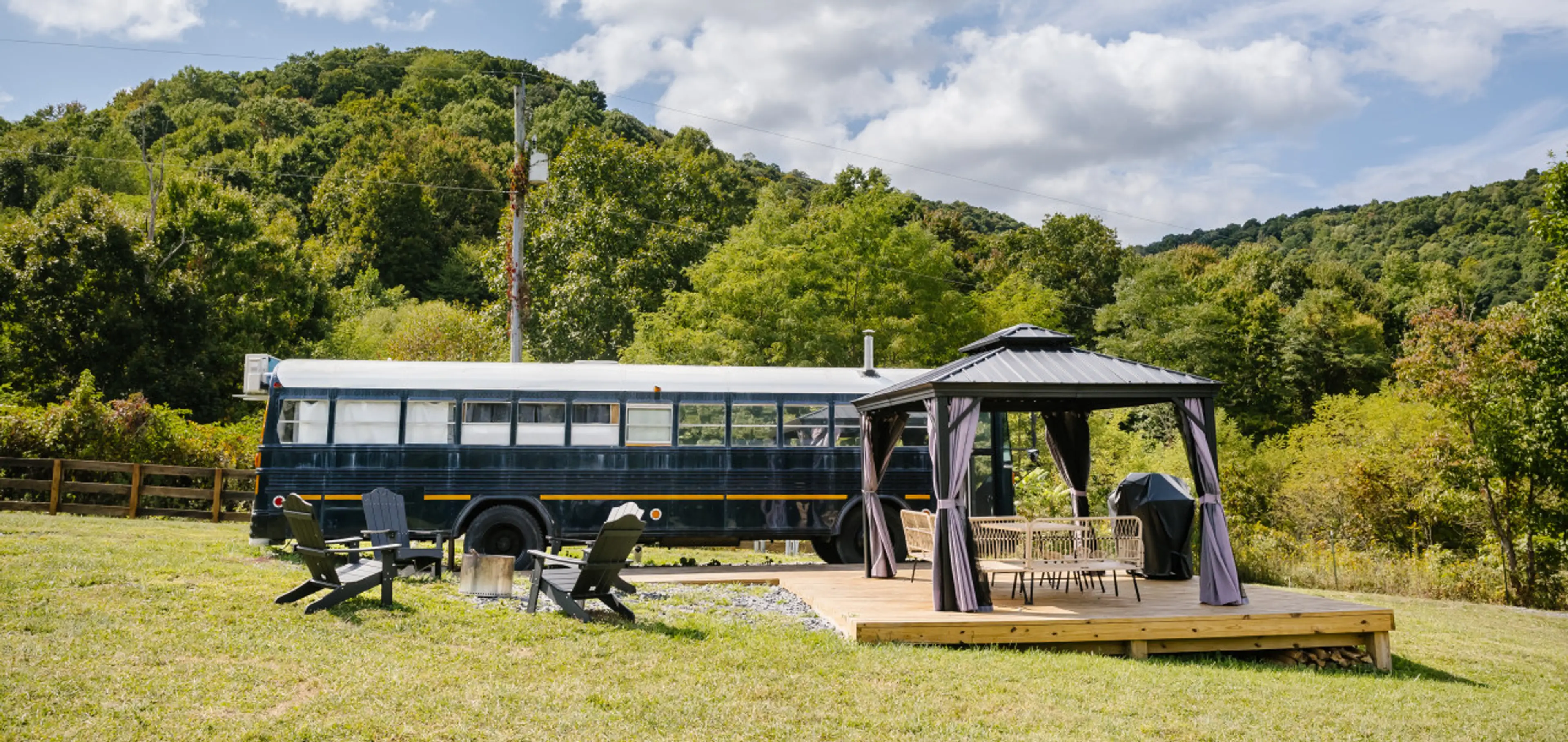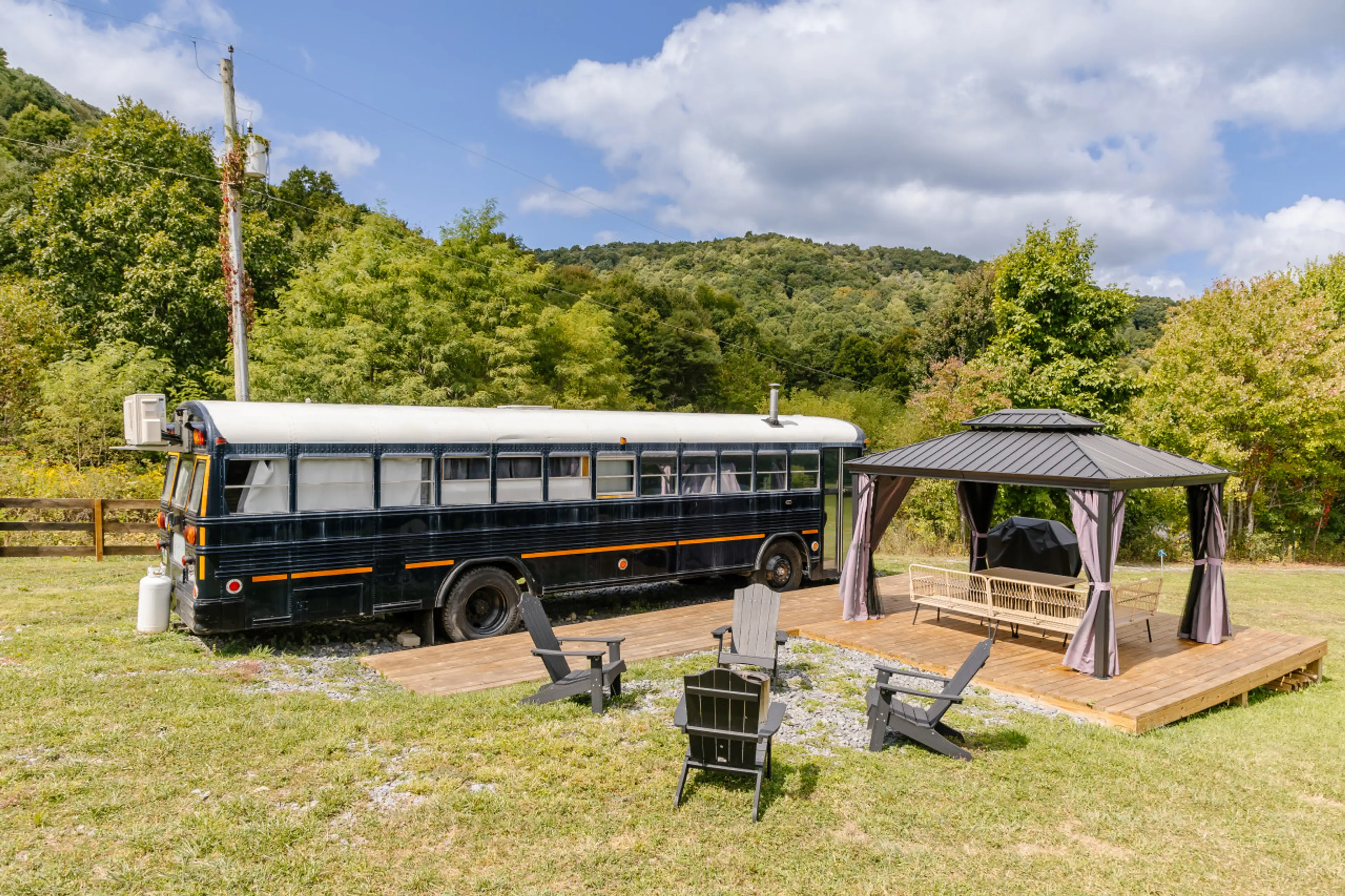 Reconnect with nature at this unforgettable escape. West Virginia really is “almost heaven”. The Schoolies are located just a few miles from the New River Gorge National Park. The buses are located conveniently off a well maintained gravel road and face beautiful rolling hills with hay and wildflow...